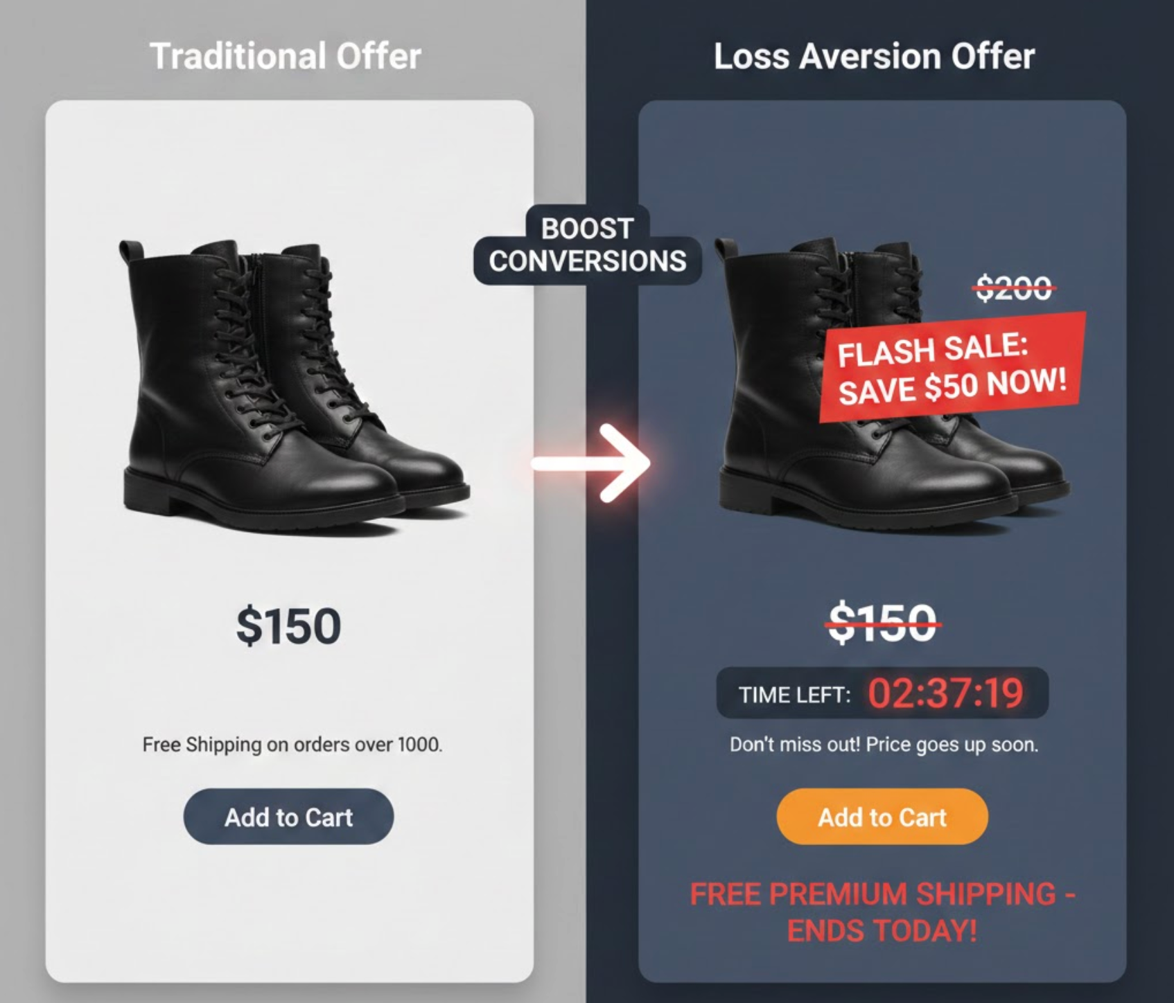 In addition, eCommerce transactions involve risk. Customers worry about wasting money, dealing with returns, or regretting their purchase later. Loss-based messaging speaks directly to these fears and helps users resolve internal conflict.