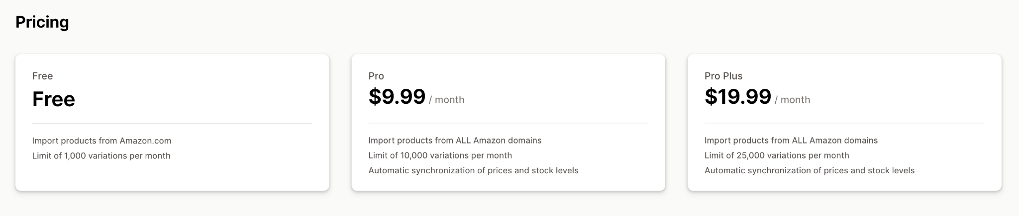 Amazon product prices and stock levels can change frequently due to demand or promotions. The app periodically syncs this data to help keep Shopify listings aligned with the original Amazon source. This reduces the risk of selling products at outdated prices or when inventory is no longer available. Sync performance may vary depending on the selected plan and Amazon data updates.